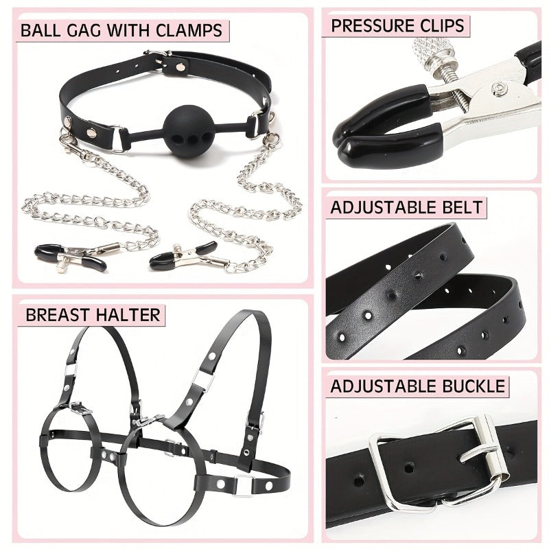 3-In-1 Women's Restraint Set With Gag And Nipple Clamps